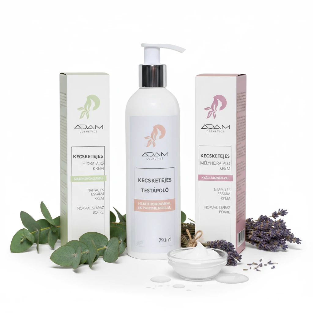 Kecsketejes hidratáló arckrém selyemproteinnel (50ml): INGREDIENTS: AQUA, GLYCERIN, BUTYROSPERMUM PARKII BUTTER, CETEARYL ALCOHOL, CAPRAE LAC POWDER, POLYSORBATE 60, CERA ALBA, LANOLIN, SILK AMINO ACIDS, PANTHENOL, TOCOPHEROL, BENZYL ALCOHOL, GLYCINE SOJA OIL, DEHYDROACETIC ACID, LACTIC ACID, PARFUM Kecsketejes mélyhidratáló arckrém hialuronsavval (50ml): INGREDIENTS: AQUA, GLYCERIN, CETEARYL ALCOHOL, BUTYROSPERMUM PARKII BUTTER, CAPRAE LAC POWDER, POLYSORBATE 60, CERA ALBA, LANOLIN, SODIUM HYALURONATE, CALENDULA OFFICINALIS FLOWER EXTRACT, TOCOPHEROL, GLYCINE SOJA OIL, LACTIC ACID, BENZYL ALCOHOL, DEHYDROACETIC ACID, PARFUM Kecsketejes testápoló hialuronsavval és panthenollal (250ml): INGREDIENTS: AQUA, COCOS NUCIFERA OIL, CETEARYL ALCOHOL, BUTYROSPERMUM PARKII BUTTER, POLYSORBATE 60, CAPRAE LAC POWDER, BENZYL ALCOHOL, SIMMONDSIA CHINENSIS SEED OIL, VITIS VINIFERA SEED OIL, PARFUM, GLYCINE SOJA OIL, PANTHENOL, SODIUM HYALURONATE, DEHYDROACETIC ACID, TOCOPHEROL