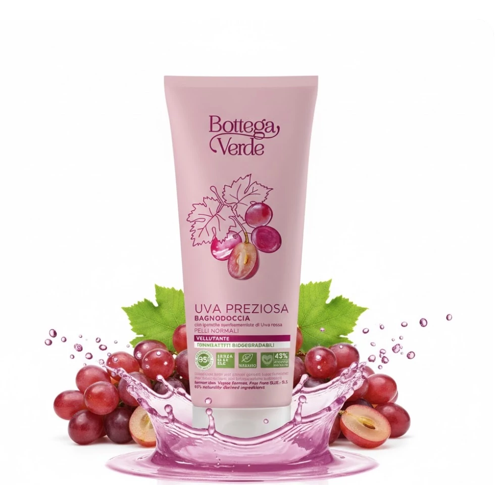 Az Uva Preziosa egy friss és kellemes közérzetet biztosító, illatosított kisimító tusfürdő, amely ideális a napi tisztálkodáshoz. A 200 ml-es kiszerelésű termék különösen kíméletes a környezethez, mivel biológiailag lebomló felületaktív anyagokat tartalmaz, és mentes az SLES/SLS összetevőktől.