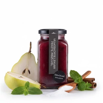 Érett illatos és szaftos vilmoskörtéből és fekete ribizliből, hozzáadott cukor nélkül  készült lekvár.