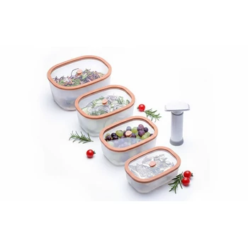 Status Fresko Polipropilén vákuumtároló szett edzett üveg tetővel ( Lazac 0,5 L + 0,9 L + 1,4 L + 2,3 L ) + 1 db kézi vákuumpumpa