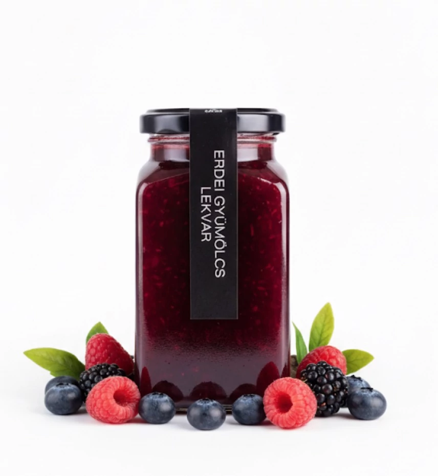 Erdei vegyesgyümölcs 81 % (málna, fekete ribizli, piros ribizli, áfonya), cukor, pektin, sűrített citromlé