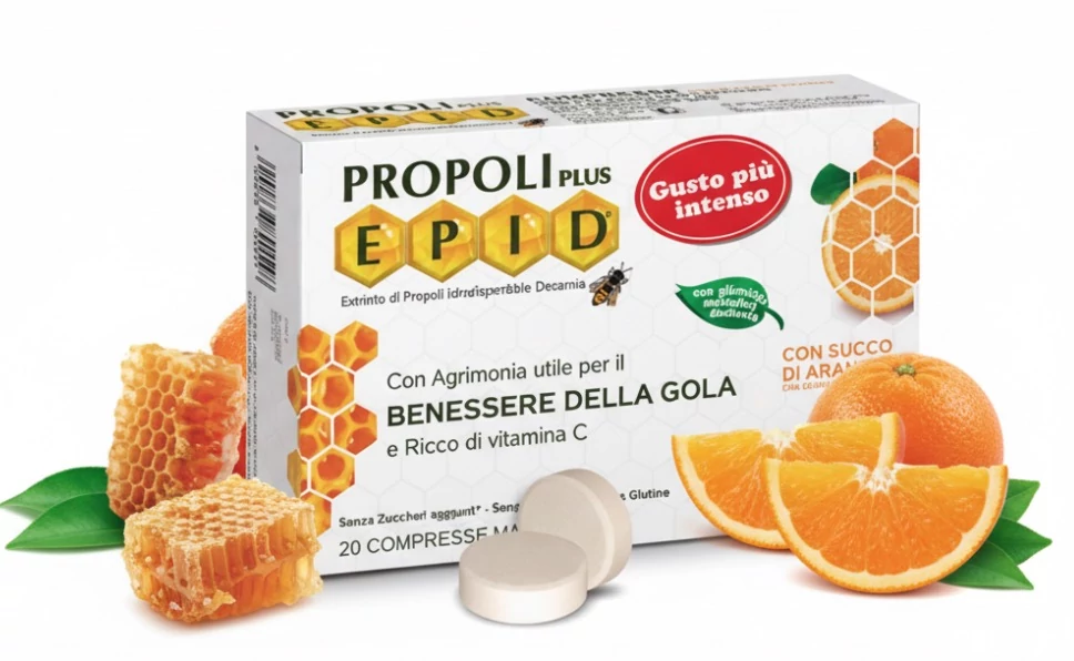Összetevők: édesítőszerek [szorbit, szteviol-glikozidok (Stevia rebaudiana Bertoni leveléből), szukralóz], dehidratált narancs lé, EPID®- tisztított és viaszmentesített propolisz kivonat,– titrált 3% polifenollal, Apróbojtorján (Agrimonia eupatoria L.) virágos hajtásának kivonata 4:1, csipkebogyó kivonat (Rosa Canina L.)- titrált 70% C-vitaminnal, aroma (narancs), csomósodást gátló anyagok (szilícium-dioxid, zsírsavak magnéziumsói), savanyúságot szabályozó anyag (citromsav). 3Természetes módon előforduló cukrokat tartalmaz.
