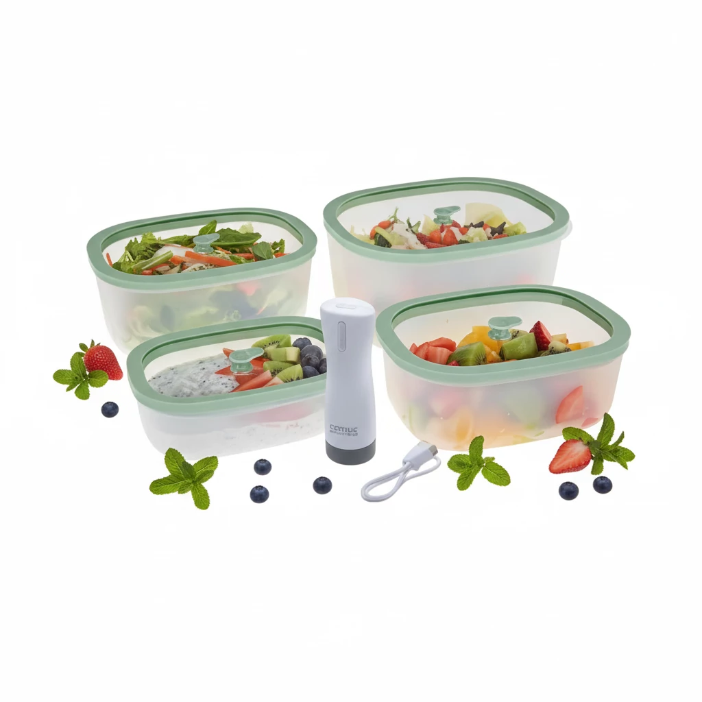 Ez a menta színű szett négy különböző méretű tárolót (0,5 L, 0,9 L, 1,4 L, 2,3 L) és egy nagy teljesítményű BVP-50 akkumulátoros vákuumpumpát tartalmaz, így garantálva az élelmiszerek optimális tárolását.